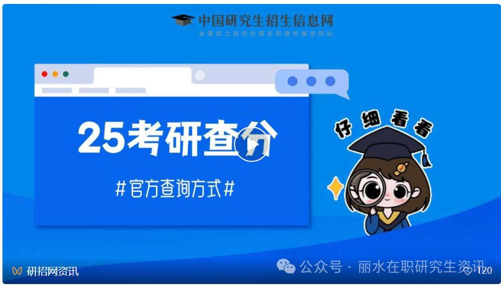 2、考生應(yīng)密切關(guān)注各省招生考試機構(gòu)和招生單位通知,及時獲知成績查詢時間。研招網(wǎng)(微信號:chsiyz)、研招網(wǎng)資訊(微信號:chsiky)、學(xué)信網(wǎng)服務(wù)號(微信號:chsi_chesicc)也會及時推送相關(guān)消息。