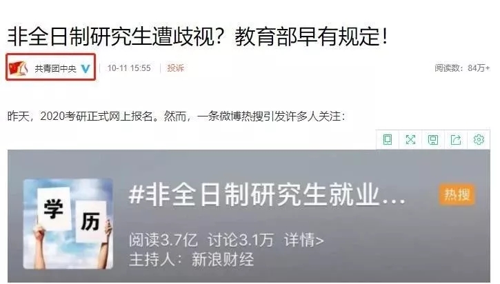 去年10月考研報名前夕,#非全日制研究生就業(yè)遭歧視# 話題引爆網(wǎng)絡,話題閱讀量近4億,約28萬人參與討論。隨后,共青團中央、人民日報、央廣網(wǎng)等接連轉載發(fā)聲,聲援非全日制研究生。