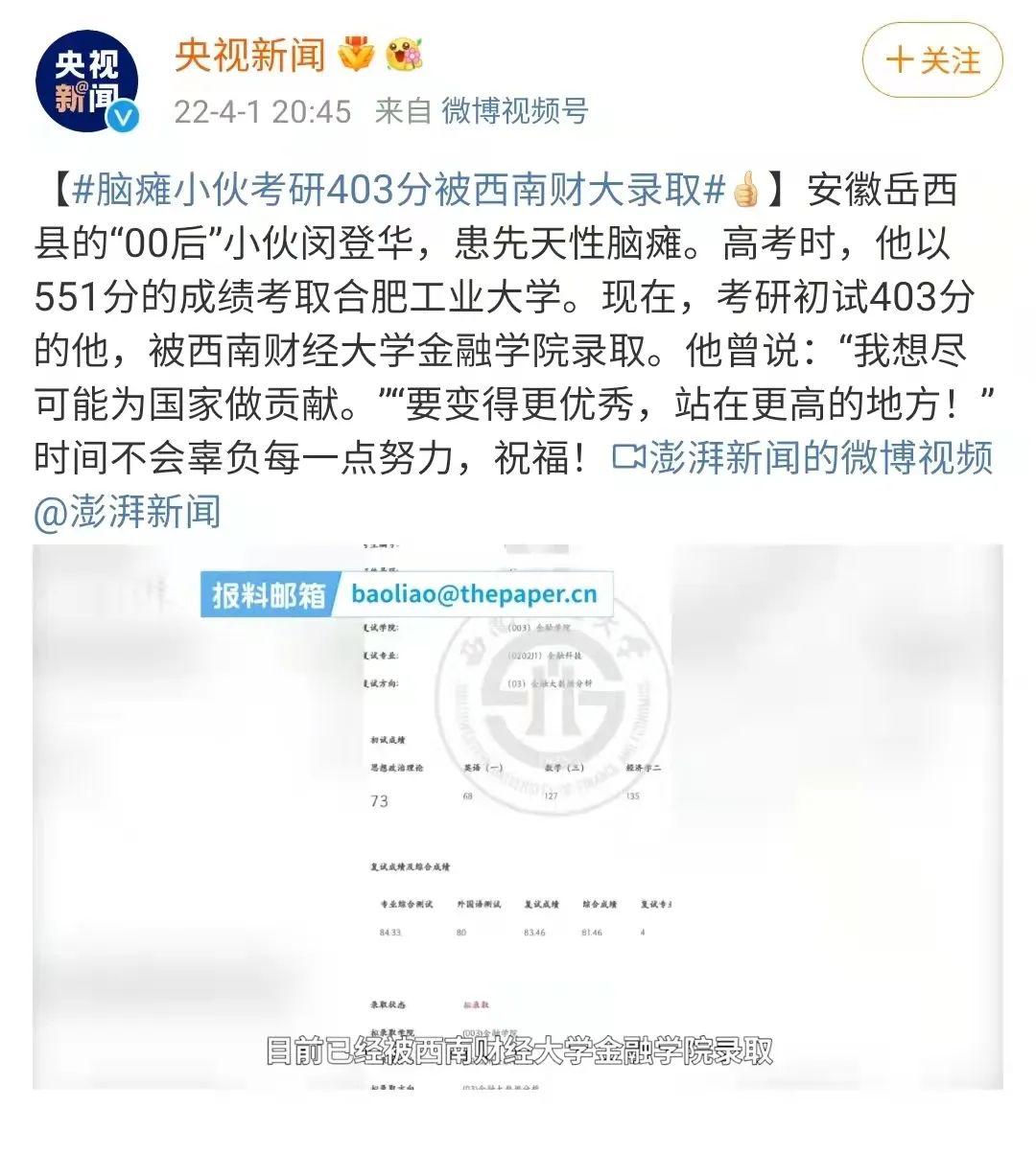 403分對普通考研人來說,已是難以觸及,對這樣一個“腦癱患者”來說更是不易。