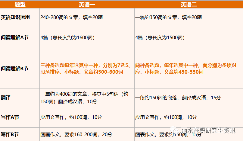 考試形式相同:筆試閉卷,滿分100分,考試時(shí)間為180分鐘,英語(yǔ)一各個(gè)板塊的試卷難度都大于英語(yǔ)二。