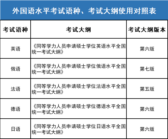 以同等學(xué)力申請(qǐng)碩士學(xué)位人員(以下簡(jiǎn)稱(chēng)同等學(xué)力人員)須參加外國(guó)語(yǔ)水平考試,應(yīng)試語(yǔ)種應(yīng)與申請(qǐng)學(xué)位相應(yīng)學(xué)科在校碩士研究生培養(yǎng)方案規(guī)定的語(yǔ)種相同。全國(guó)統(tǒng)一組織的外國(guó)語(yǔ)水平考試主要語(yǔ)種為英語(yǔ)、俄語(yǔ)、法語(yǔ)、德語(yǔ)和日語(yǔ),考試大綱見(jiàn)附件1。