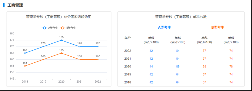 近五年工商管理專碩總分國(guó)家線趨勢(shì)圖