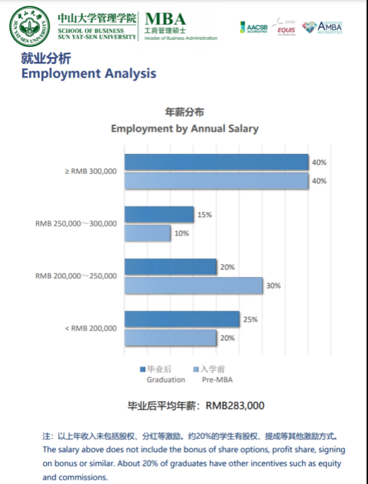 中山大學(xué)MBA畢業(yè)后薪資對(duì)比入學(xué)前,畢業(yè)生年薪小于25萬(wàn)人數(shù)占比減少了5%,年薪25萬(wàn)以上的人數(shù)占比增加5%,在不計(jì)入股權(quán)、分紅等激勵(lì)的情況下,平均年薪達(dá)到了28.3萬(wàn)。