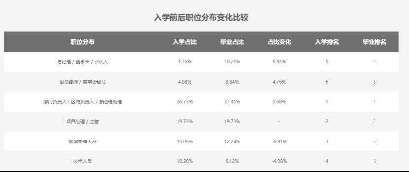 據(jù)根據(jù)部分招生單位公布的就業(yè)數(shù)據(jù)來(lái)看,畢業(yè)生可以到咨詢、金融、科技等MBA主流行業(yè)就業(yè),除此以外,IT\電信業(yè)、教育\文化\傳媒廣告業(yè)、房地產(chǎn)業(yè)等行業(yè)也是MBA的熱門選擇。不少畢業(yè)生成功轉(zhuǎn)行、晉升管理層,可見(jiàn),越來(lái)越多不同行業(yè)領(lǐng)域都需要MBA人才,畢業(yè)后的就業(yè)選擇多,MBA也更能適應(yīng)市場(chǎng)的需求。例如,從浙江大學(xué)MBA入學(xué)前后職位分布變化的比較中可以看出,MBA畢業(yè)后從事高層管理職位的占比增大,學(xué)業(yè)的完成也為未來(lái)的職業(yè)道路錦上添花。