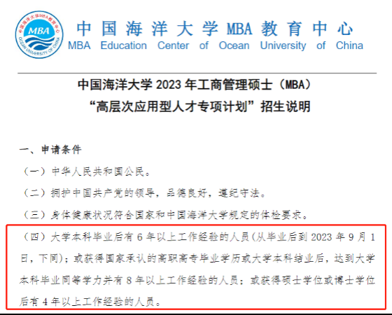 值得注意的是,部分招生單位對(duì)于學(xué)歷要求有不同的調(diào)整。如下圖所示,中國(guó)海洋大學(xué)2023年MBA“高層次應(yīng)用型人才專項(xiàng)計(jì)劃”有更長(zhǎng)的工作年限要求。